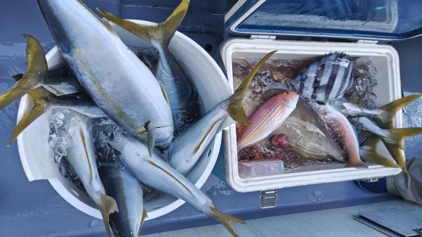 イナダに交じりマダイ3人とも型みて0.4〜2.0k1〜3枚
